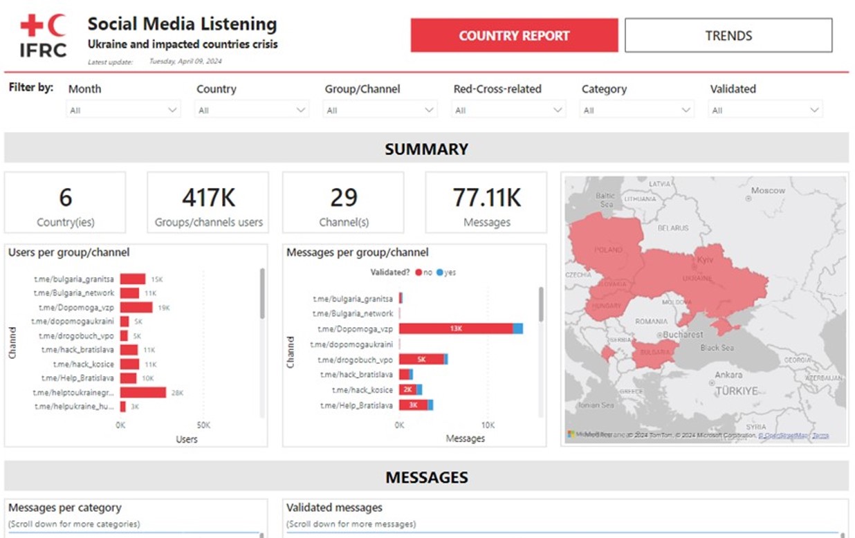 The Social Media Listening tool allows for continuous feedback collection that is unbiased and can be used when it’s challenging to access or communicate with people affected. In June 2022, 510 started providing the SML service with more than 20 Telegram groups in Ukraine and neighbouring countries (Poland, Slovakia, Romania – Moldova and Bulgaria were added in February 2023 and Hungary in august 2023). Every two weeks, a data model developed by 510 Data Scientists, scrapes, translates and classifies thousands of messages posted in these Telegram groups. A large sample of these messages is then read by 510 CEA officers, who code and analyze them into actionable information that includes Frequently Asked Questions, needs, and more general insights.